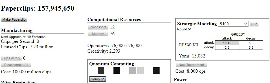 Similar to Cookie Clicker, Universal Paperclips is a game about clicking to manufacture paperclips, as well as managing your finances to do so. It starts off rudimentary but it won’t be long until you’re sucked in, messing with quantum computers, and sending probes out into an interstellar war. There’s a reason every website had a thinkpiece up about this recently, it’s damn engrossing!