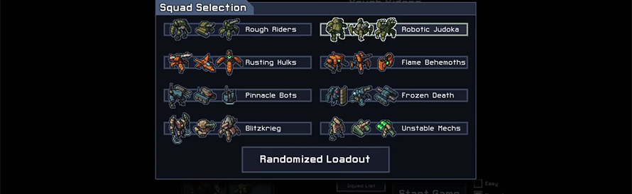 Each mission you can send out mechs to deal with the alien menace. You know that scene in Pacific Rim where they carry the Jaegers with helicopters then drop them in Hong Kong bay? Yeah, like that. Except cute pixelated Jaegers. The mechs are where a lot of the customisation comes in. You can get eight different squads, and equip different weapons and abilities. You can take long-range artillery mechs, big armoured fight-y mechs that throw enemies across the map, or specialised mechs that do things like freeze enemies. You can even get a randomly-generated squad, sort of a gamble button to either get a extremely strong squad or…not. The pilots themselves will level up and gain passive abilities, making them stronger and stronger…and more painful to lose.