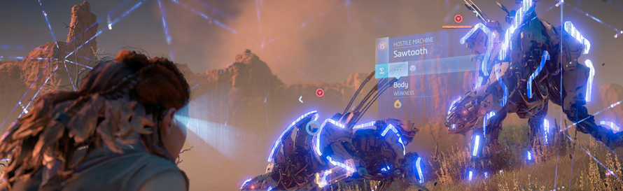 Possibly the handiest tool you will ever use in Horizon Zero Dawn, the focus lets you scan the surrounding area, and will flag up any enemies and machine wildlife in the vicinity. What’s more, it will also give you information on each machine you scan including elemental weaknesses, weak points, its patrol route and its level. So if you think you have the capabilities of taking down a Snap maw early in the game, give it a quick scan just to see how out matched you will be. The focus can also be used to tag enemies, just to give you that little bit of extra help when it comes to locating where your soon to be opponents are.