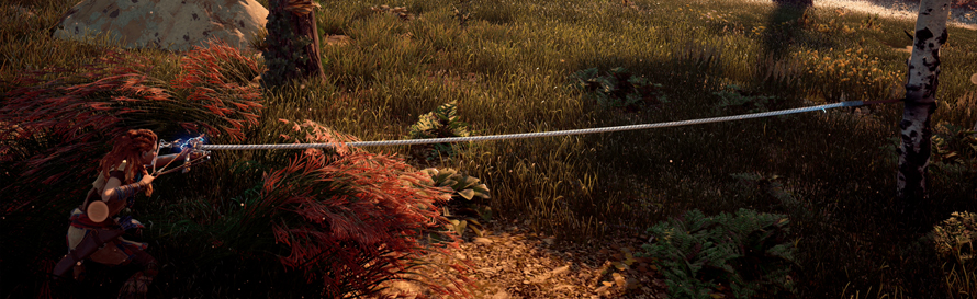 If however you find yourself one on one with a machine then the Ropecaster will help you subdue the mechanical beast for a time. The Ropecaster fires a rope and automatically pins the machine to the ground. A few shots are needed to bring down the bigger beasts and once pinned, you are able then to go in with a flurry of melee attacks with your spear. Make sure you hit the critical strike when prompted.