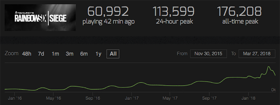 Whilst For Honor hasn’t caught up with RSS, it’s numbers have been creeping up in the last few months. Both games have the chance to be successful because they have a unique prospect for gamers. Where else can you abseil down a building with your mates, knock out the wall with your sledgehammer, work through the rooms taking out terrorists with myriad gadgets and weaponry? The same goes with For Honor, just how many other games give you mastery over medieval melee combat?