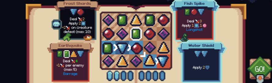 In the simplest terms, Witching Stone is a puzzle roguelike where you match gems in specific orders in order to cast spells. For example, a spell might require two upside-down triangles to cast, while another might require an upside-down triangle, a circle, a square, and then another upside-down triangle. If you manage to match just do the two upside-down triangles, you’ll cast the first spell, but if you manage to match the second one, you’ll get both spells.